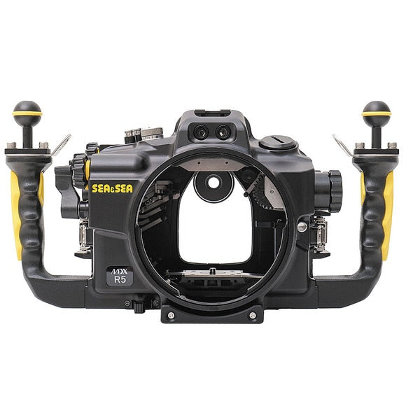 The MDX-R5 Underwater Housing with Leak Alarm Unit from Sea & Sea features all controls ergonomically designed to maximize the Canon EOS R5 operation. All major camera functions can be accessed from the grip handles through thumb or finger movement without releasing your grip.